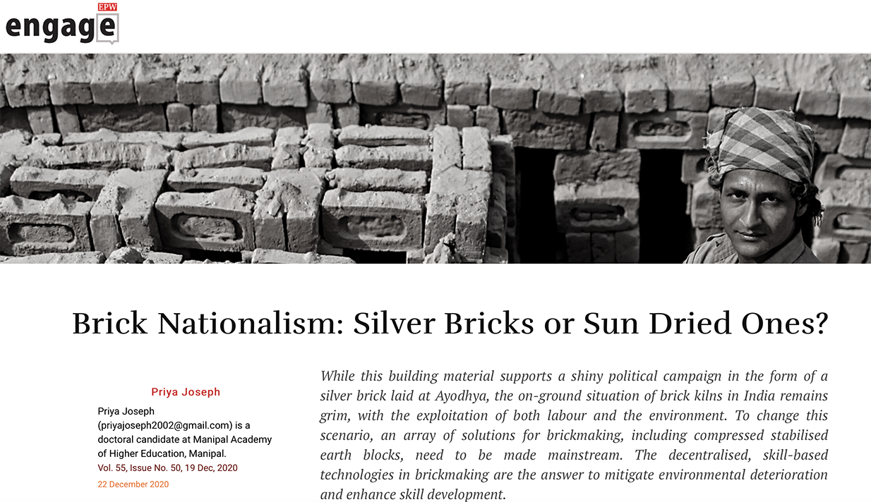 Economic and Political Weekly Publication: Brick Nationalism: Silver Bricks or Sun Dried Ones? Year:2020 Download:https://www.epw.in/engage/article/brick-nationalism-silver-bricks-or-sun-dried-ones While this building material supports a shiny political campaign in the form of a silver brick laid at Ayodhya, the on-ground situation of brick kilns in India remains grim, with the exploitation of both labour and the environment. To change this scenario, an array of solutions for brickmaking, including compressed stabilised earth blocks, need to be made mainstream. The decentralised, skill-based technologies in brickmaking are the answer to mitigate environmental deterioration and enhance skill development. |